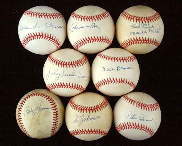 Description:Lot of (8) deceased player single-signed baseballs (VG-NM). Incl. L.Coleman NL ball (light toning) signed by Mace Brown; L.Coleman NL ball signed by Pete Coscarart; L.Coleman NL ball (toning) signed by Mark Fidrych with "1976 AL ROY" "The Bird" inscriptions; W.White NL ball (toning) signed by Si Johnson; L.Coleman NL ball signed by Claude Passeau; L.Coleman NL ball (light toning) signed by Preacher Roe; C.Feeney NL ball (VG, usage wear) signed by Bobby Thomson; and W.White NL ball (light toning) signed by Johnny Vander Meer with "6/11/38" "6/15/38" inscriptions. Signatures rate 7/8 to 9/10 out of 10: VG-NM