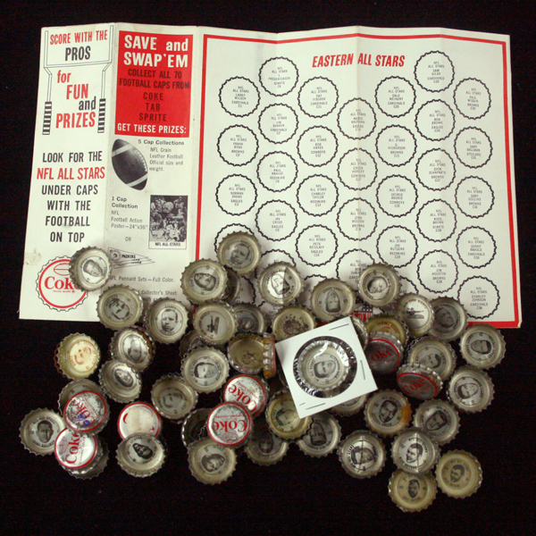 Description:Lot of approx. (350) NFL Coke bottle caps, c.1960s (GD-NM). Most appear to be from 1965 and 1966 issues. Lot includes HOFers such as Dick Butkus, Gale Sayers, Fran Tarkenton, and others. Various conditions throughout lot. Most appear to grade VG overall, with surface scratches mainly to outer portion of caps. Comes with NFL All-Stars saver sheet: GD-NM