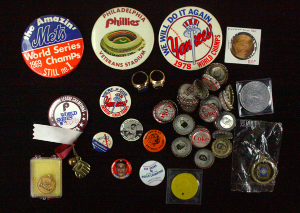 Description:Lot of (50) Baseball pins, Coke caps, coins, etc. (PR-NM). Incl. c.1950s Philadelphia Phillies pin; c.1950s PM10 Ted Williams pin; c.1950s Detroit Tigers pin; 1951 Al Schacht's Restaurant New York Yankees schedule coin; Ruben Gomez 1956 Topps pin; Yogi Berra 1960 Armour coin (hole punched through); (32) c.1960s Coke bottle caps with Al Kaline, Frank Robinson, and others (VG overall); 1965 Minnesota Twins commemorative coin; 1969 New York Mets World Series Champs pin; 1969 Mets World Series Champs keychain; c.1970s Phillies Veterans Stadium pin; (3) different c.1970s Yankees pins; 1980 All-Star Game press charm; 1983 Phillies World Series pin; and (2) c.1980s-90s Yankees souvenir rings. With exception to Coke caps, other items appear to grade EX overall. Range: PR-NM