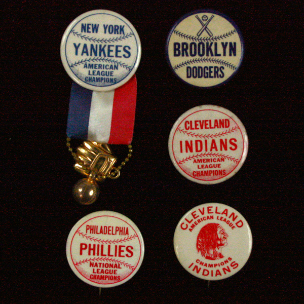 Description:Lot of (5) vintage baseball team pins, c.1950s (EX-NM). Incl. 1950 Philadelphia Phillies National League Champions pin (EX-EX/MT); c.1950s Brooklyn Dodgers pin (EX); (2) different 1954 Cleveland Indians American League Champions pins (EX-EX/MT); and c.1950s New York Yankees American League Champions pin with ribbon and ball/glove charms still attached (NM). Range: EX-NM