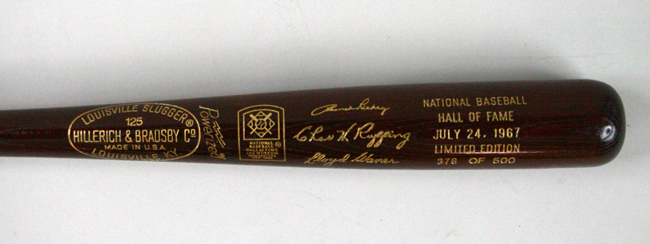 Description:1967 Baseball Hall of Fame Induction Louisville Slugger bat (NM). 34" brown bat which commemorates the 1967 HOF inductions of Branch Rickey, Red Ruffing, and Lloyd Waner. Limited edition #ed 378 of 500: NM