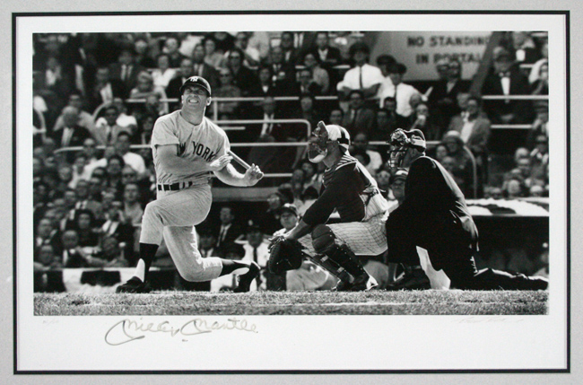 Description:Mickey Mantle signed b&w photo by Robert Riger (framed, NM). Notable 12.5"x19.5" b&w image of Mantle grimacing in pain while batting taken by photographer Robert Riger. Mantle signed the photo in marker at the bottom. The signature has faded and rates 7 out of 10. Photo is also signed by Riger in ink and hand #ed 26/50. Photo is housed in an 18.5"x25.5" frame: NM