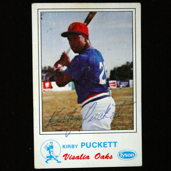 Description:Kirby Puckett signed 1983 Fritsch Visalia Oaks card (very early signature, VG-VG/EX). Card #6 in the set signed in the period by Puckett in blue ink. Rare pre MLB signature of Puckett rating 8 out of 10. Card exhibits light corner wear and a crease on the lower left corner: VG-VG/EX