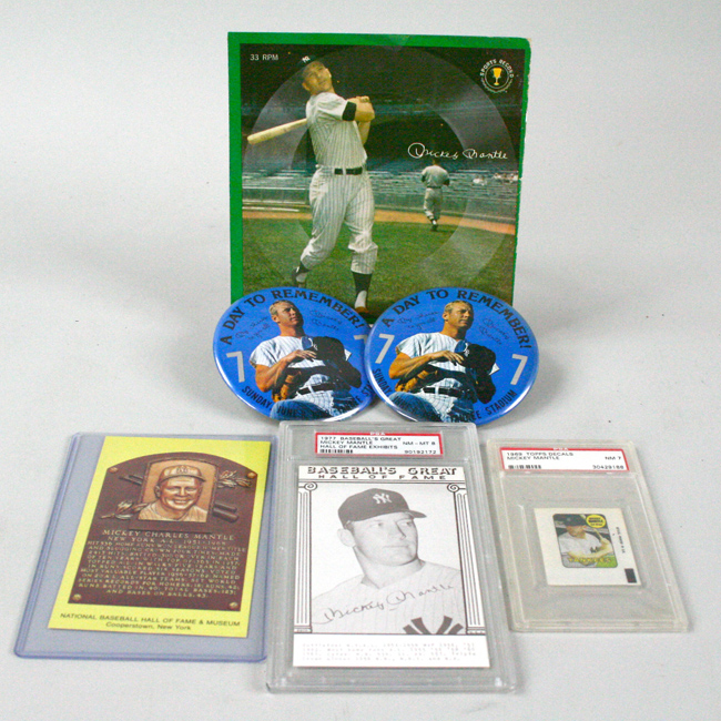 Description:Lot of (6) Mickey Mantle items including (2) PSA graded (GD/VG-NM/MT). Includes: 1969 Topps Decals Mickey Mantle (PSA 7 NM); 1977 Baseball's Great Hall of Fame Exhibits Mickey Mantle (PSA 8 NM-MT); (2) June 8, 1969 "A Day To Remember!" pins (EX/MT, EX); 1962 Auravision Mickey Mantle record (GD/VG); and a modern Mickey Mantle yellow HOF plaque (EX/MT).
