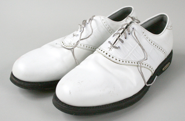 Description:Pair of Michael Jordan's personal Footjoy golf shoes (EX). White leather size 13 Footjoy Classics Tour golf shoes. Pair exhibits heavy usage wear including surface scuffing/soiling and course residue on the bottoms. The offered golf shoes originated from the personal collection of Michael Jordan and include COA from Upper Deck Authenticated: EX