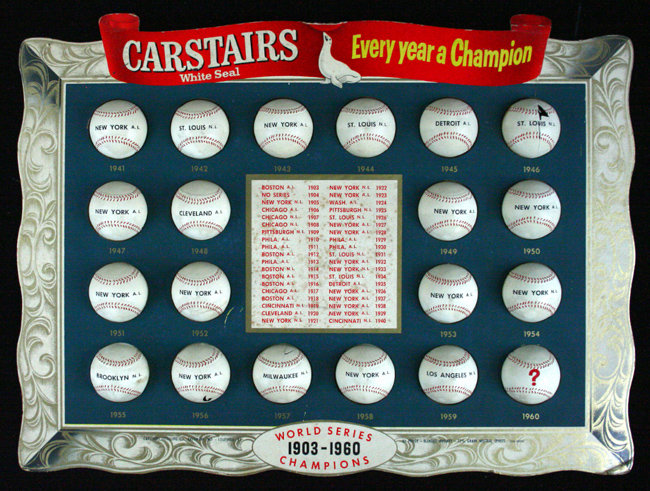 Description:1960 Carstairs Whiskey "World Series Champions" display (VG-EX). 22"x30 1/4" cardboard and plastic display which reads "Carstairs White Seal - Every Year a Champion" across the top and "World Series Champions 1903-1960" at the bottom. Featured at the center is a listing of the World Series Champion teams from 1903 to 1959 with the 1941 to 1959 teams displayed on plastic baseballs. One plastic ball has a "?" on it for 1960 as the 1960 World Series did not occur yet. Exhibits some and edge and corner wear. There are also a few small cracks and minor holing in the plastic baseballs. The plastic insert is attached the back with clear tape. Displays as VG-EX overall.