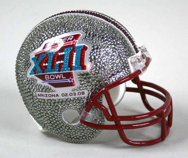 Description:Fine Super Bowl XLII crystallized mini helmet by Frosted Gear (NM). Riddell mini helmet with "Super Bowl XLII - Arizona 02.03.08" decals on each side. Helmet has been decorated with Swarovski crystals and is guaranteed unique with approx. 2,673 individually placed crystals (please note that approx. (10) crystals are missing from the left decal). Includes a COA from Frosted Gear which reads "We hereby certify that the "Super Bowl XLII" mini helmet in finest cut Swarovski crystal is authentic and hand made.": NM with note to missing crystals.