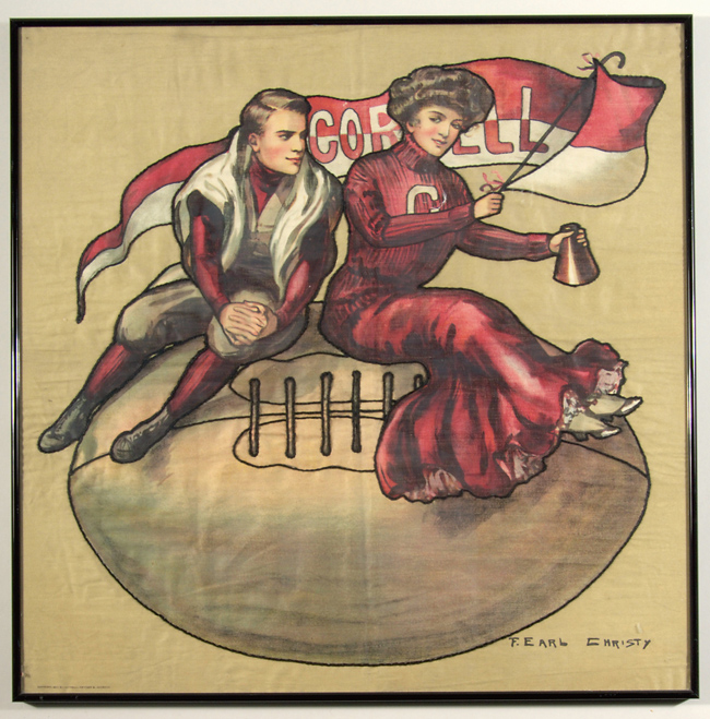 Description:Cornell football pillowtop by F.Earl Christy c.1907 (EX). Beautiful color lithographic football illustration by noted artist F. Earl Christy features a uniformed player atop an oversized ball. 22.5" Square matted and framed: EX