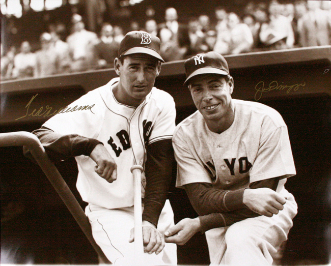 Description:Ted Williams & Joe DiMaggio dual-signed 16"x20" sepia toned photo from The Brearley Collection PSA/DNA (displays as NM). Modern printed photo from the original negative of The Brearley Collection. Williams and DiMaggio signed the photo in gold marker. Signatures rate 9/10 out of 10. Photo has "The Brearley Collection" stamping on back and embossed seal at the bottom right. Photo exhibits minimal wear overall with a small area of minor creasing on the right edge. Includes a full LOA from PSA/DNA: displays as NM.