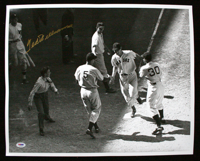 Description:Ted Williams signed 16"x20" b&w photo PSA/DNA (NM/MT). Notable image originating from The Brearley Collection. Williams signed the photo in gold marker. Signature rates 9 out of 10. Includes a full LOA from PSA/DNA: NM/MT