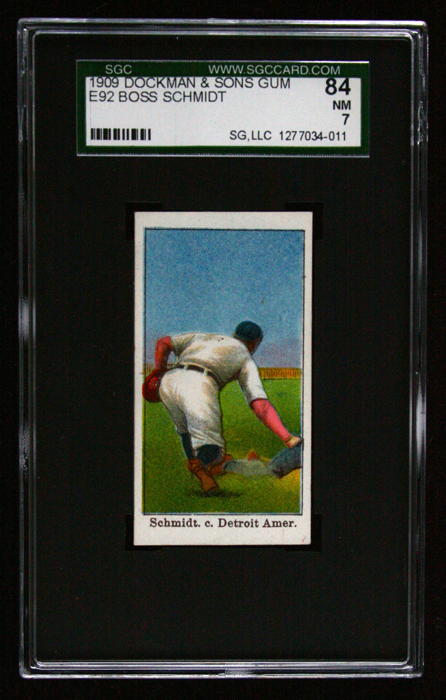 Description:1909 E92 Dockman & Sons Gum Boss Schmidt (SGC 84 NM). The highest graded example by SGC with one equally graded example by PSA. Features great color, very nice centering, NM-MT corners, and clean surfaces. Graded SGC 84: NM