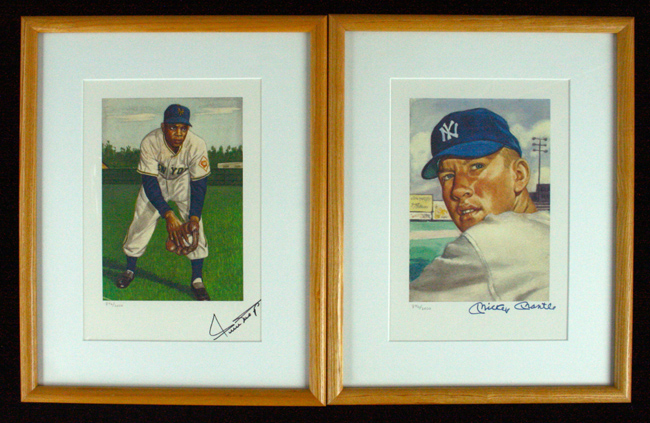 Description:Mickey Mantle and Willie Mays signed 1953 Topps artwork lithographs issued by Marriott (NM/MT, framed). Original color lithographs issued by the Marriott Corporation in 1989. Mantle signed in blue sharpie and Mays signed in black sharpie. Both signatures rate 9/10 out of 10. Each litho is hand #ed 896/2000. Both are matted and housed in 15"x19" frames. Each includes a LOA from the Marriott Corporation: NM/MT