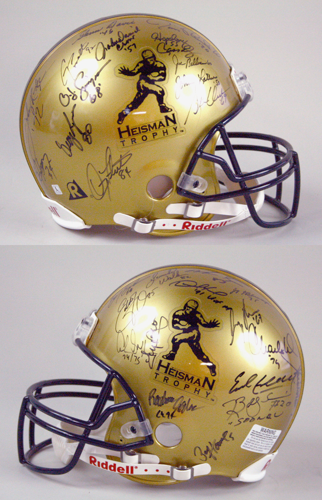 Description:Heisman Trophy winners multi-signed full-size Pro Line helmet with (28) signatures STEINER (NM/MT). Riddell VSR-4 model helmet signed by (28) Heisman winners including Barry Sanders, Bo Jackson, Herschel Walker, Earl Campbell, Marcus Allen, Paul Hornung, O.J. Simpson, Jim Plunkett, Hopalong Cassidy, Doug Flutie, Johnny Rodgers, Johnny Lattner, John David Crow, Tony Dorsett, Mike Rozier, Billy Sims, and others. All are signed in black marker and rate 8 to 9 out of 10. Includes a COA from Steiner. A Steiner hologram is affixed to the back: NM/MT