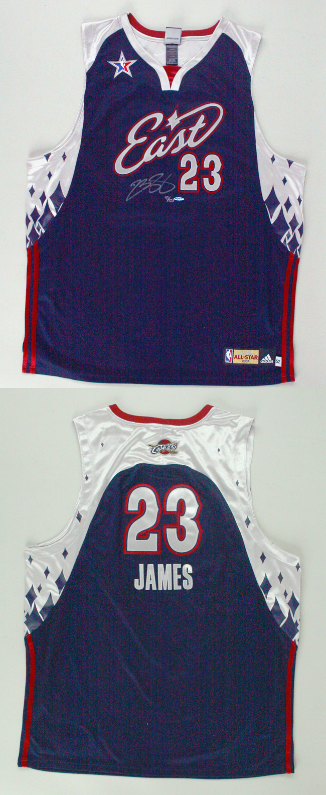 Description:LeBron James signed 2007 All-Star Game jersey UDA (NM/MT). Adidas size 52 pull over jersey with "East" across front, "JAMES" on back, and "23" on front and back. Adidas size 52 and Las Vegas All-Star 2007 tagging on front lower left. James signed the front in silver marker. Signature rates 8/9 out of 10. Includes a COA from Upper Deck Authenticated. An Upper Deck Authenticated serial #ed hologram is affixed to the jersey. Limited edition hand #ed 93/123. Jersey is unworn: NM/MT
