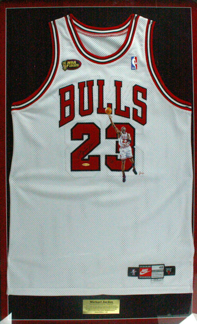 Description:Michael Jordan signed 1998 Chicago Bulls NBA Finals jersey with hand-painted image UDA (framed, NM). Nike size 48 (Length +4) white Michael Jordan jersey with "NBA Finals" patch on the upper right of the front. Jordan signed the "2" on the front in black marker. Signature rates 10 out of 10. A hand-painted image of Jordan titled "Finger Roll" is over the "3" on the front. The painting was done by artist Jolene Jessie. Jersey is hand #ed 1/6. Includes a COA from Upper Deck Authenticated (UDA serial #ed hologram is affixed to the jersey). Jersey is housed in a 33"x51" frame: NM ***Please note that due to the size of the frame, S/H may be substantial.***