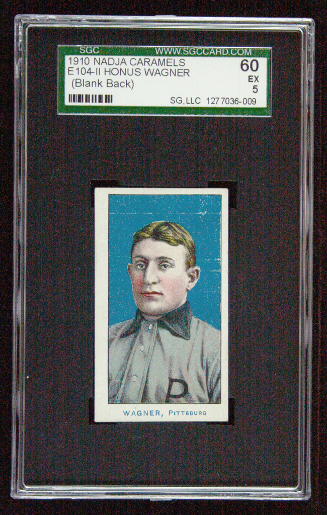 Description:1910 E104-II Nadja Caramels Honus Wagner (SGC 60 EX). Blank backed. One of only two examples graded at this level by SGC, with none graded higher. Features good color and registration with clean front and back surfaces. Displays very well exhibiting minor light even corner wear. Graded SGC 60: EX