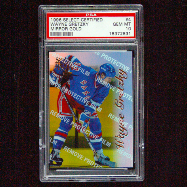 Description:1996-97 Select Certified #4 Wayne Gretzky, Mirror Gold variation, graded PSA 10 (GEM MT). Virtually flawless card with sharp corners and protective film still on the card. Graded PSA 10: GEM MINT