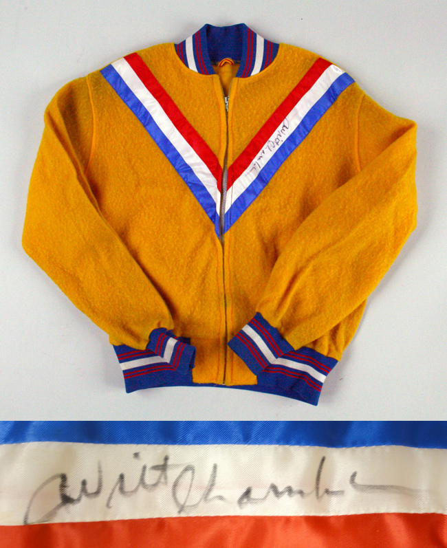 Description:Wilt Chamberlain signed Philadelphia Warriors jacket c.1980s JSA (EX/MT). Synthetic wool yellow jacket with red, white, and blue trim/striping and "WARRIORS" and team mascot on the back. Chamberlain signed the front left in black marker on the white line within the red, white, and blue striping. Signature rates 8 out of 10 (note that the signature displays upside down). Jacket has no manufacturer or size markings, but appears to be an adult size large. Includes a full LOA from JSA: EX/MT
