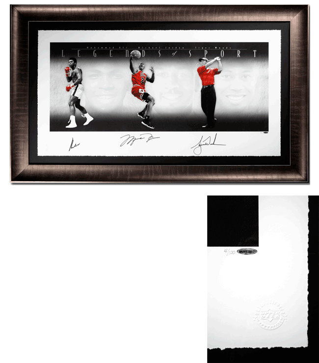 Description:UDA "Legends of Sport" Triple-signed Platinum Edition with Michael Jordan, Muhammad Ali and Tiger Woods (NM). This oversized framed piece was hand signed by Muhammad Ali, Michael Jordan, & Tiger Woods under UDA’s Patented 5-Step Authentication Process. Each individual signature was placed by the athlete below the design print to maximize signature visibility and ensure that the artistic design of the piece remained unobstructed. Each print is finished with Hand-Numbering in pencil, the art industry standard for the numbering of such art releases. This item titled, "Legends of Sport" and is printed on archival quality P-Velvet Paper which provides 100% ink absorption for vivid color. This is the rare platinum edition numbered 15/100. It measures 36x60 in the frame and the print itself measures 25x48. Includes a COA from Upper Deck Authenticated. As nice of an item Upper Deck as ever manufactured with 3 of the greatest athletes in history: NM ***Please note that due to the size of the frame, S/H may be substantial.***