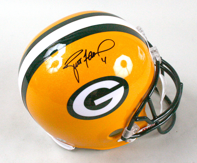 Description:Brett Favre signed Green Bay Packers helmet, Favre authenticated (NM). Riddell Packers replica helmet signed by Favre in black marker with "4" inscription. Signature rates 9 out of 10. Comes with Brett Favre COA (serial #ed sticker is affixed): NM