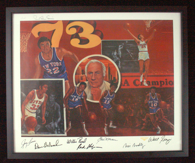 Description:1972/73 New York Knicks NBA Champions multi-signed 24"x29" artist proof litho by Robert Stephen Simon (framed, NM). (7) members of the champion team signed the litho including Walt Frazier, Bill Bradley, Earl Monroe, Red Holzman, Willis Reed, Dave DeBusschere, and Jerry Lucas. All are signed in black marker and rate 9 to 10 out of 10. Litho is housed in a 26"x31" frame: NM