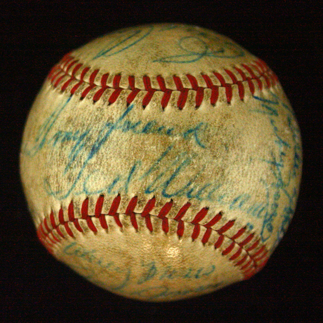 Description:1948 Boston Red Sox team-signed baseball (VG-VG/EX). Appears to be an official AL ball, but the stampings are worn off. There are (24) signatures on the ball including Ted Williams, Joe McCarthy, Earle Combs, Johnny Pesky, Stan Spence, Boo Ferris, Earl Caldwell, Mel Parnell, Wally Moses, Vern Stephens, Bill Hitchcock, and others. All are signed in blue ink and rate 5 to 6 out of 10 on average and range 3 to 7. Ball exhibits moderate usage wear including soiling: VG-VG/EX
