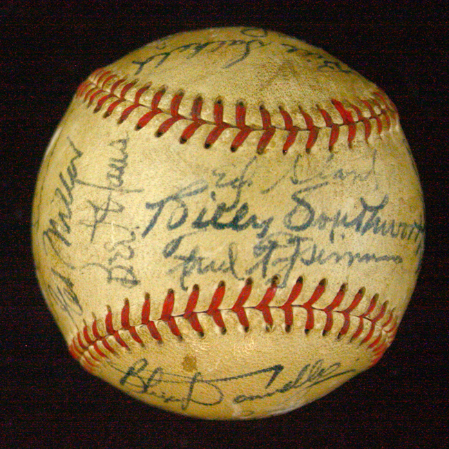 Description:Multi-signed F.Frick NL baseball with (25) signatures including Billy Southworth c.1948 (VG-VG/EX). Signers include: Billy Southworth, Benny Bengough, Dutch Leonard, Schoolboy Rowe, Ken Heintzelman, Blix Donnelly, Nelson Potter, Al Dark, Ernie White, Don Padget, Curt Simmons, Ed Miller, Fred Fitzsimmons, Red Barrett, Bob Elliott, and others. All are signed in ink and rate 7 to 8 out of 10 on average with a few lighter. Ball exhibits usage wear including soiling and surface wear: VG-VG/EX