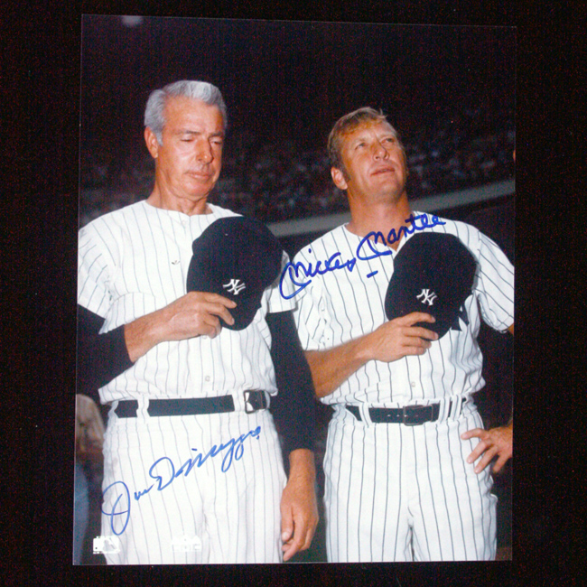 Description:Mickey Mantle & Joe DiMaggio dual-signed 8"x10" color photo, JSA (NM/MT). Mantle and DiMaggio both signed the photo in blue marker. Mantle signature rates 9/10 out of 10. DiMaggio signature rates 8 out of 10. Authenticated by JSA (serial #ed sticker is affixed to the back of the photo, does not include the paper COA): NM/MT