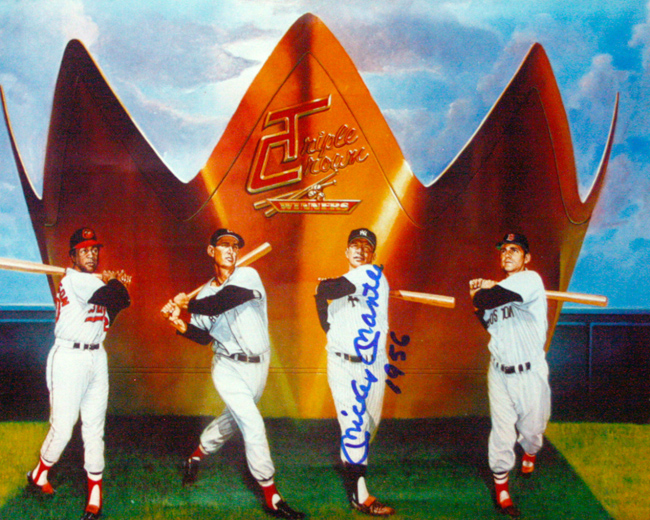 Description:Mickey Mantle signed and "1956" inscribed 8"x10" color Triple Crown photo print (NM/MT). Mantle signed the photo print in blue marker and added "1956" inscription. Signature rates 9 out of 10: NM/MT