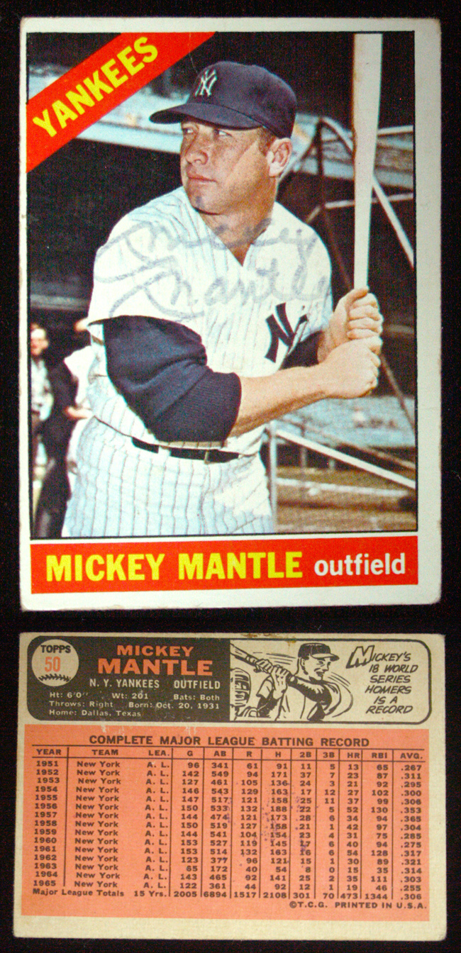 Description:Mickey Mantle signed 1966 Topps #50 card (VG-VG/EX). Mantle signed the front of the card in blue fine tip marker. Signature rates 6/7 out of 10. The card exhibits corner wear and a small crease at the top: VG-VG/EX