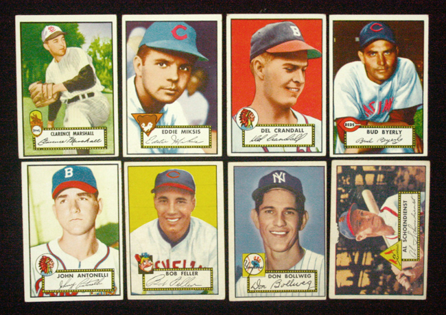 Lot of (28) 1952 Topps Baseball cards with Bob Feller (PR-EX). Includes #s 40, 88 Bob Feller (VG), 91 Red Schoendienst (PR), 97, 100, 107, 113, 117, 121, 123, 125, 128 Bollweg (VG/EX (OC)), 134, 135, 138, 140 Antonelli (EX), 143, 146, 147, 148, 151 Post (EX miscut), 153, 161 Byerly (EX), 162 Crandall (VG/EX), 164, 166, 172 Miksis (GD/VG), and 174 Marshall (EX). Most grade VG-VG/EX. Range PR-EX