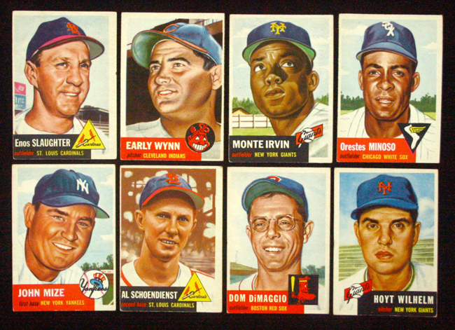 Lot of (42) different 1953 Topps Baseball cards (PR-EX). Includes #s 6, 9 Collins (VG/EX (OC)), 14 Labine (GD), 19, 23, 24, 25, 26 Mitchell (VG/EX), 35, 36, 38, 41 Slaughter (VG/EX (OC)), 44 Kinder (GD), 52, 53, 56, 61 Wynn (VG), 62 Irvin (EX), 66 Minoso (EX), 77 Mize (EX), 78 Schoendienst (GD), 80, 85, 97, 109 Dark (VG/EX), 126, 128, 133, 135 Rosen (VG-VG/EX), 149 DiMaggio (EX), 150, 151 Wilhelm (VG), 152, 153, 154 Groat (PR, ink on back), 158 Logan (VG), 159, 163, 165, 166, 175, and 197. Most grade VG. Range PR-EX