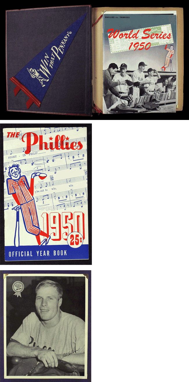 Description:1950 Philadelphia Phillies related scrapbook including World Series program, mini pennant, and much more (EX-EX/MT overall). Approx. 2.5"x12"x13" bound scrapbook filled with various articles related to the 1950 Phillies including 12.5" "Win That Pennant" mini pennant; 1950 World Series program (EX/MT-NM, not affixed); 1950 Phillies roster/schedule pamphlet; 1950 Philadelphia Bulletin Pin-Ups set; 1950 Philadelphia Inquirer Fightin' Phillies set; 1950 Phillies yearbook; and numerous newspaper clipping and photos. Appearance remains very fine overall. Most pieces are affixed on the album pages, with some having become loosened or unattached: EX-EX/MT overall