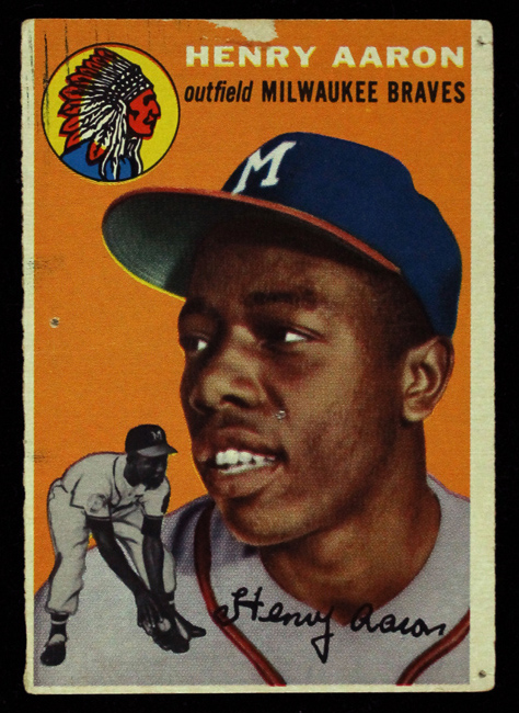 Description:1954 Topps #128 Hank Aaron rookie card (PR, displays better). Displays well overall, but exhibits pin holes at the right corners, one at the center of the left side, and one an Aaron's cheek. There is also some surface loss at the top of the front. Nice example to have signed: PR
