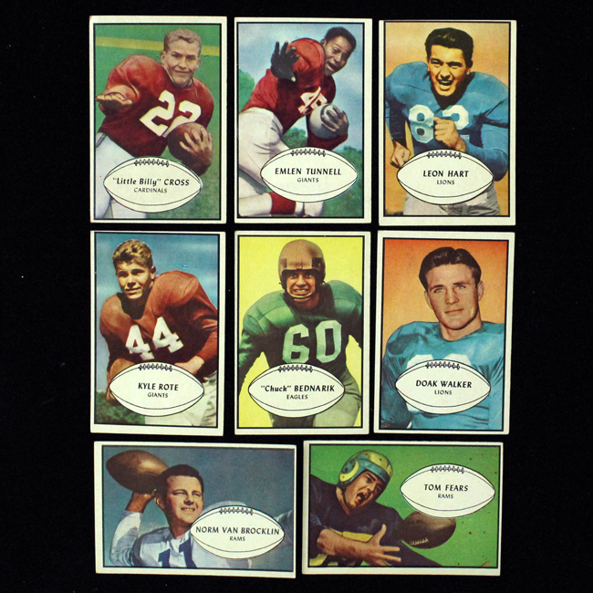 Description:Lot of (8) 1953 Bowman Football HOFer and Star cards (VG/EX-EX). Includes #s 6 Doak Walker (EX), 11 Norm Van Brocklin (EX (OC)), 24 Chuck Bednarik (VG/EX-EX), 25 Kyle Rote (EX (OC)), 31 Leon Hart (EX (OC)), 36 Tom Fears (EX), 53 Emlen Tunnel (VG/EX), and 96 William Cross (VG/EX).