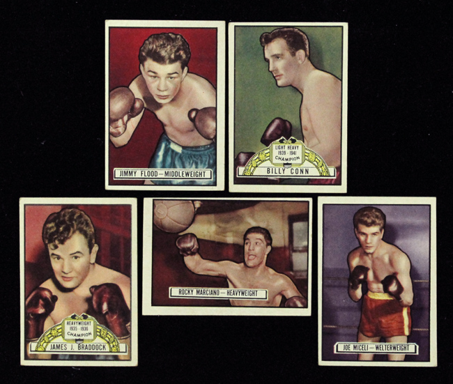 Lot of (5) 1951 Topps Ringside Boxing cards with Rocky Marciano (VG/EX-EX). Includes #s 4 (VG/EX), 12 (EX), 24 Braddock (EX), 26 (VG/EX), and 32 Rocky Marciano (EX (OC)).