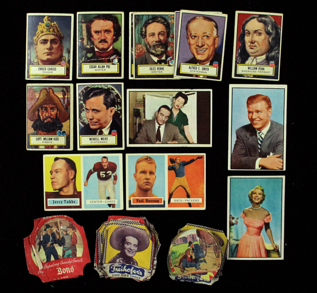Lot of (272) 1950 to 1957 non-sports and football cards (PR-EX). Includes: (56) 1950 Topps Hopalong Cassidy cards (VG overall); (3) 1951 Topps Jets, Rockets, and Spacemen cards (EX); (82) 1952 Topps Look and See cards (VG-VG/EX overall); (2) 1952 Topps Wings cards (PR/GD); (20) 1952 Bowman U.S. Presidents (VG-EX); (30) 1953 Bowman NBC Radio/TV Stars cards (VG/EX overall); (10) 1953 Bowman Antique Autos cards (EX overall); (10) 1954 Topps World on Wheels cards (VG/EX overall); (8) 1954 Quaker Oats cards (EX overall); (2) 1957 Topps Football cards with #s 125 Tubbs (GD/VG) and 151 Hornung (GD); and (49) 1950s Bond and Freihofer's Hopalong Cassidy and Cisco Kids Choice bread labels (many have been separated from their borders, PR-GD).