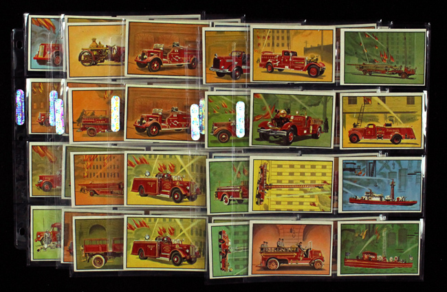 Lot of (56) 1953 Bowman Firefighters cards (EX overall). Includes #s 1, 2, 4, 5, 6, 7, 8, 9, (2) 10, 11, 12, 15, 19, 20, 21, 24, (2) 25, (2) 26, 27, 28, (2) 29l 30, 31, 32, (2) 33, (3) 34, 35, 36, (2) 37, (2) 38, 39, 40, 44, 45, 49, 50, 51, 54, 55, 57, 58, 59, 60, 61, 62, 63, and 64. Cards grade EX overall with some lesser or better grade.