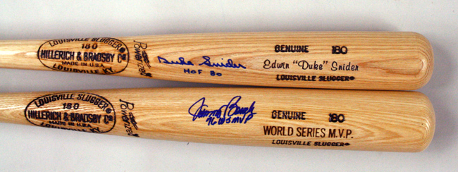 Description:Johnny Bench and Duke Snider signed and inscribed baseball bats (NM). Includes: 34" Louisville Slugger 180 World Series MVP bat signed by Johnny Bench in blue marker with "76 WS MVP" inscription. And a 34" Louisville Slugger 180 Edwin "Duke" Snider bat signed by Snider in blue marker with "HOF 80" inscription. Signatures rate 9/10 out of 10: NM