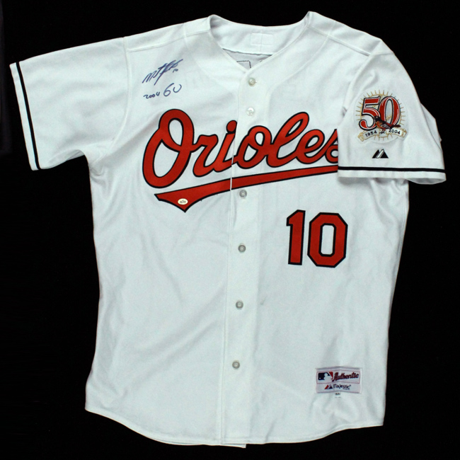 Description:2004 Miguel Tejada game-used and signed Baltimore Orioles jersey (EX/MT). Polyester button down jersey with "Orioles" across front, "TEJADA" across back, and "10" on front and back. A 1954 to 2004 Orioles 50th Anniversary patch is on the left sleeve. Majestic size 48 tagging appears on the front lower left and "0062" wash tag is on the interior. Tejada signed the front upper right in blue marker and added "2004 GU" inscription. Signature rates 8 out of 10. Jersey exhibits light to moderate usage and wash wear: EX/MT