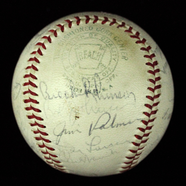 Description:1965 Baltimore Orioles team-signed J.Cronin AL baseball, JSA (EX). There are (29) signatures on the ball including Brooks Robinson, Luis Aparicio, Jim Palmer, Boog Powell, Don Larsen, Bill Hunter, Jerry Adair, Russ Snyder, Curt Blefary, Charlie Lau, Dick Brown, Dave McNally, Stu Miller, Harry Haddix, Milt Pappas, Wally Bunker, Dick Hall, and others. All are signed in ink and rate 7 out of 10 on average and range 5 to 8 out of 10. Ball exhibits light wear with minor soiling/toning. Includes a full LOA from JSA: EX