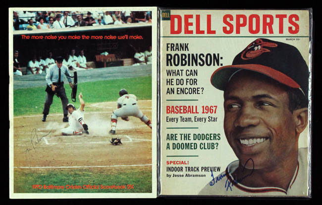Description:Lot of (3) Baltimore Orioles Hall of Famer signed publications (VG-EX/MT). Includes: Frank Robinson signed March 1967 "Dell Sports" publication (signed in blue marker on the cover, JSA COA, VG-VG/EX); Brooks Robinson signed 1977 "Thanks Brooks Day" program (signed in blue ink on the cover, EX/MT); and a vintage Jim Palmer signed 1970 Baltimore Orioles official scorebook program (signed in black ink on the cover, EX). Signatures rate 8 to 9 out of 10.