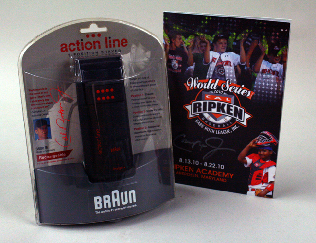 Description:Cal Ripken Jr. signed program and Cal Ripken Jr. endorsed Braun razor (EX/MT-NM). Includes a 2010 Ripken Academy World Series program signed by Cal Ripken Jr. in silver marker on the cover. Signature rates 8 out of 10. Also includes a Cal Ripken Jr. endorsed Braun electric shaver in its original unopened packaging: EX/MT-NM