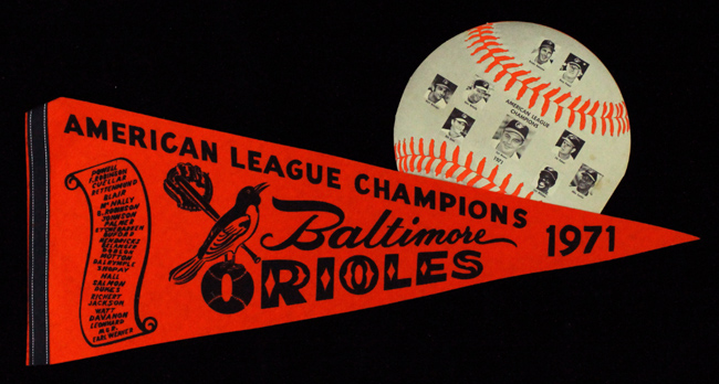Description:1971 Baltimore Orioles American League Champions pennant and Souvenir Menu (EX/MT-NM). Includes a 29" orange and black 1971 Baltimore Orioles American League Champions pennant (NM). And a 10" diameter Souvenir Menu from the Orioles "Hit and Run Club" which depicts (11) 1971 team members on the back (EX/MT).