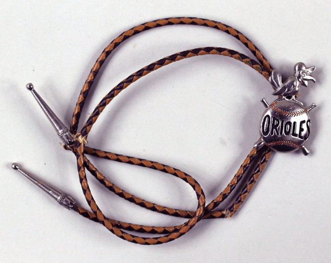 Description:Vintage Baltimore Orioles themed bolo tie c.1954 (VG/EX). Features the Orioles mascot sitting atop a baseball with "ORIOLES" in black lettering. Exhibits a few cracks in the braided leather covering: VG/EX
