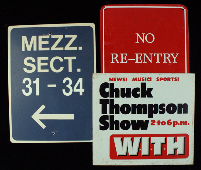 Description:Lot of (3) Baltimore Memorial Stadium metal signs (VG-EX). Includes an 18.5"x20.5" "Chuck Thompson Show - News! Music! Sports! - W.I.T.H." metal sign; 18"x24" "MEZZ. SECT. 31 - 34" seat direction sign; and an 18" square "NO RE-ENTRY" sign. All exhibit wear from usage including scattered scratches: VG-EX