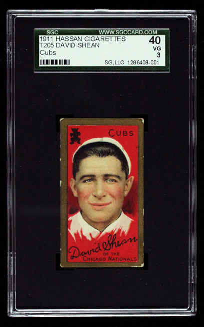 Description:1911 T205 Gold Border David Shean Chicago Cubs (SGC 40 VG). Hassan back. Nicely centered example exhibiting wear to each corner. Clean front and back. Graded SGC 40: VG