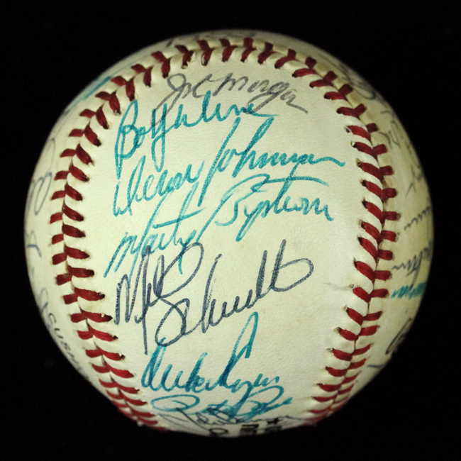 Description:1983 Philadelphia Phillies team signed baseball (EX-EX/MT). C.Feeney NL ball signed by (32) members of the 1983 National League champion Phillies including Pat Corrales, Mike Schmidt, Steve Carlton, Joe Morgan, Pete Rose, Tony Perez, Tug McGraw, Bo Diaz, Ivan DeJesus, Gary Matthews, Bob Dernier, John Denny, Marty Bystrom, Al Holland, and others. Signatures rate 7 to 10 (avg 8) out of 10. Exhibits areas of light to moderate toning: EX-EX/MT
