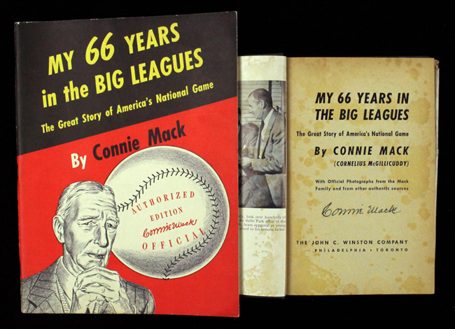 Description:Connie Mack signed "My 66 Years in the Big Leagues" hardcover book and unsigned soft cover version (VG-EX). Includes the 1950 hardcover version signed by Connie Mack in black ink on the inner title page. Signature rates 9 out of 10. The dust jacket exhibits some loss at the edges. The book itself grades VG/EX-EX overall with some age spotting within. Also includes a 1950 soft cover edition which grades EX-EX/MT.