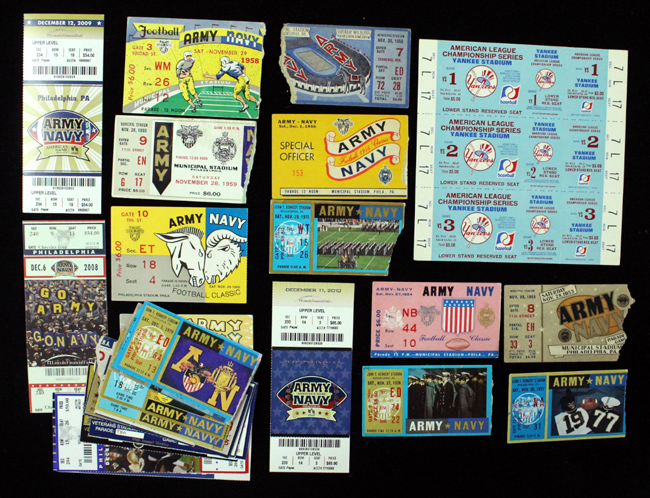 Description:Lot of (27) 1953 to 2010 Army vs. Navy Football game ticket stubs plus a 1970s Yankees NLCS phantom ticket sheet (GD-EX/MT). Army vs. Navy ticket stubs include - 1953, 1954, 1955, 1956, 1958, 1959, 1960, 1964, 1975, 1976, 1977, 1979, 1982, 1985, 1986, 1987, 1988, 1991, 1995, 1998, 2001, 2005 (full ticket), 2006 (full ticket), 2007 (full ticket), 2008 (full ticket), 2009 (full ticket), and 2010 (full ticket). Also includes an early 1970s New York Yankees American League Champion Series phantom unused ticket sheet. The Army vs. Navy tickets stubs grade GD-EX/MT. Yankees ticket sheet grades EX.